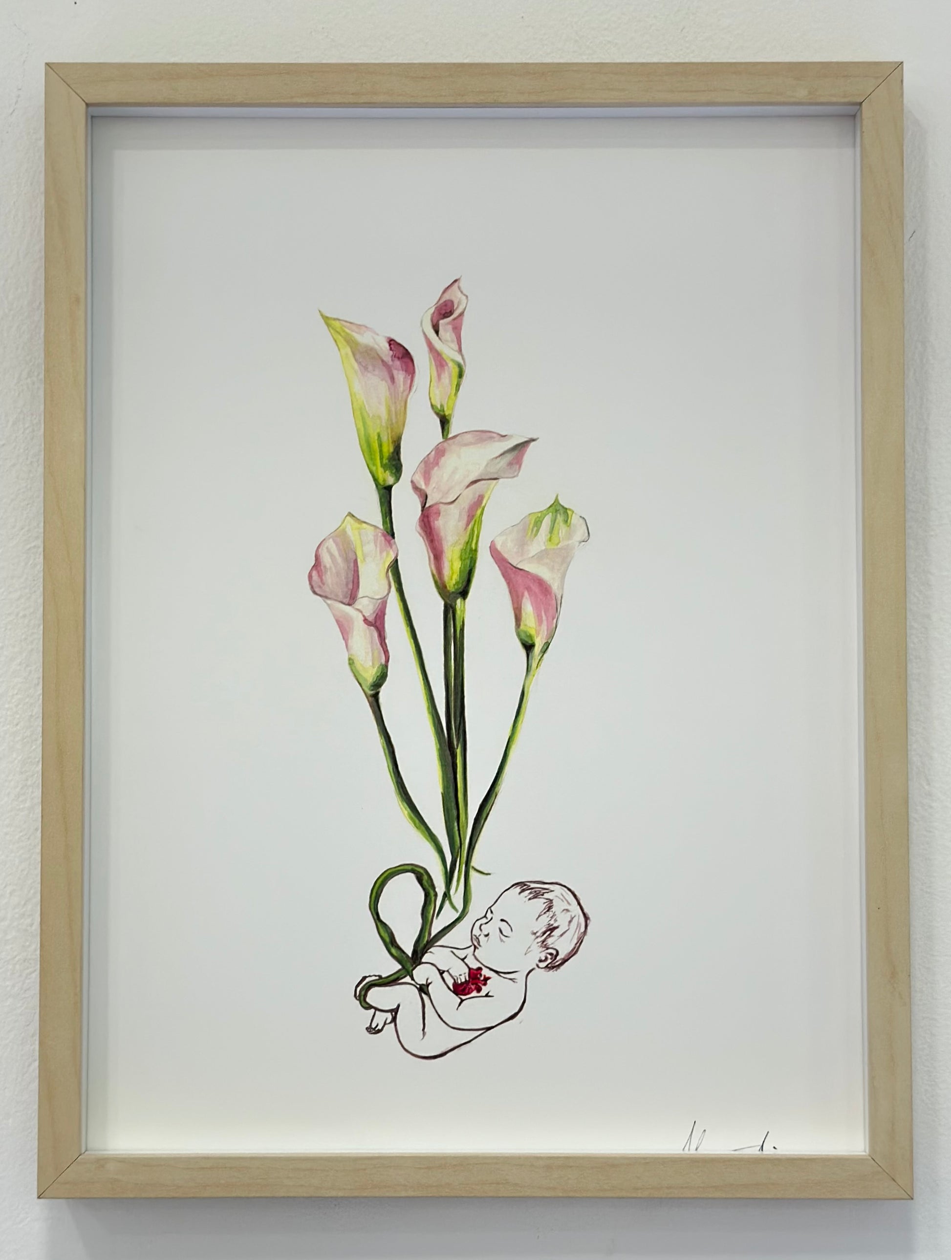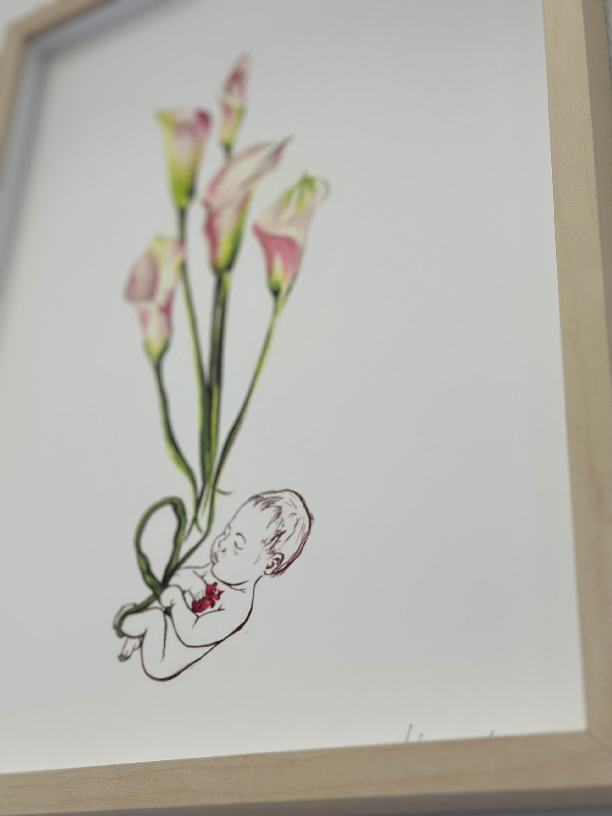 A fetus or a deceased recreate life through flowers.